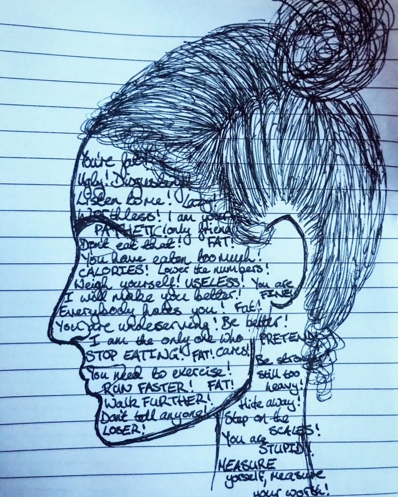 You’d see her follow me around, telling me not to eat, telling me to not sit still. Screaming at me to walk more, to run faster, to not be so pathetically lazy. Yelling at me to not be such a failure!